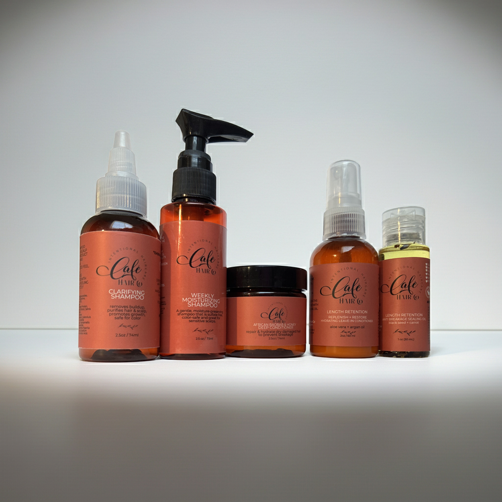 The Ceremony is Café Hair Co.’s complete, step-by-step wash day system designed specifically for textured hair that struggles to retain length. This five-product bundle works together to cleanse without stripping, replenish deep moisture, strengthen elasticity, and seal hydration — so your hair can keep what it grows.